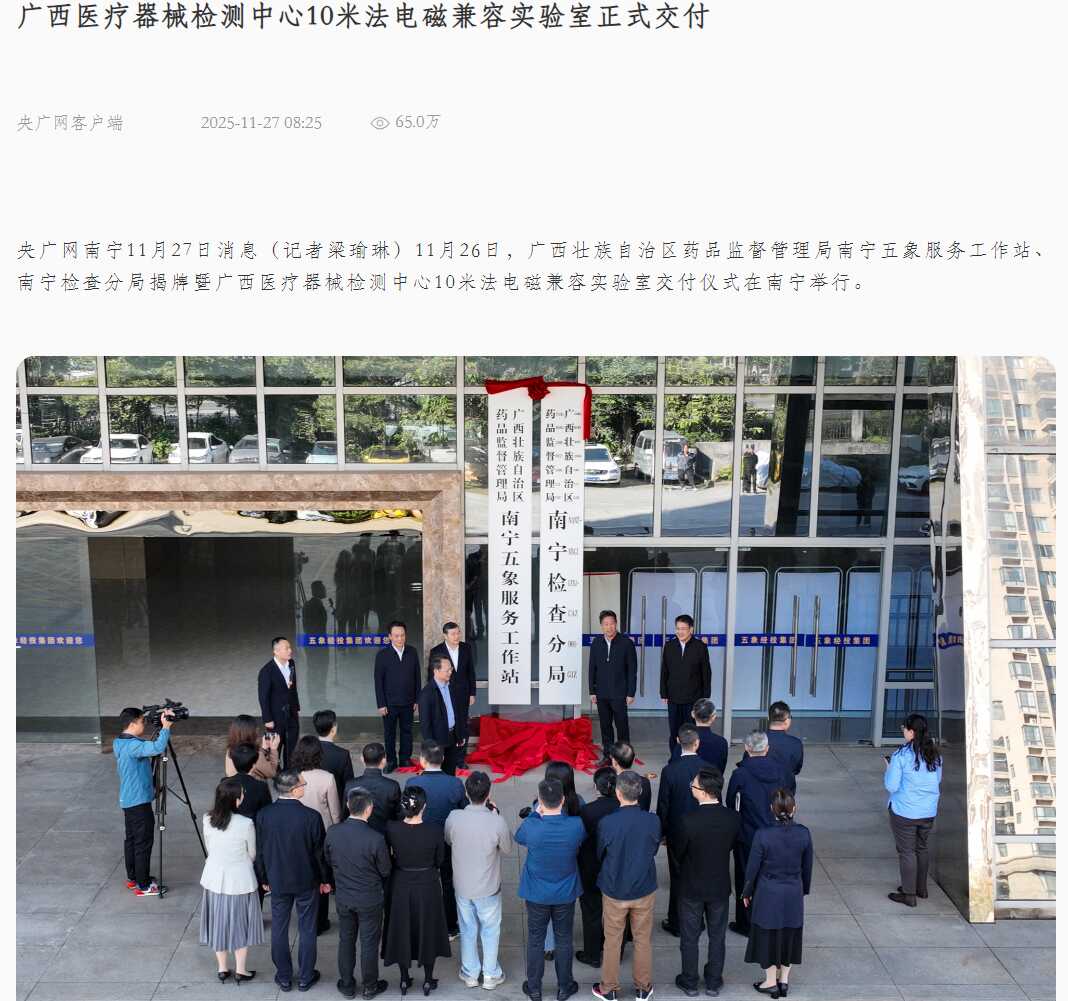 央广网南宁11月27日消息(记者梁瑜琳)11月26日,AG真人南宁五象服务工作站、南宁检查分局揭牌暨广西医疗器械检测中心10米法电磁兼容实验室交付仪式在南宁举行。